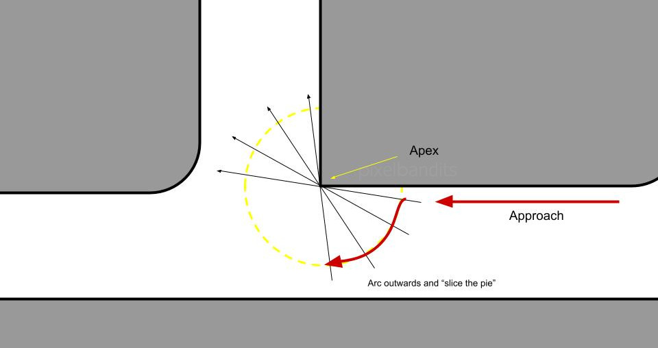 “Slicing the pie” is a genuine tactical move used by military forces and SWAT teams in real life. It basically boils down to reducing your profile and systematically looking into the area you are moving into. When approaching a doorway or corner, align yourself with the nearside wall. So if you are approaching a door or corner going left, start with your shoulder to the left wall.